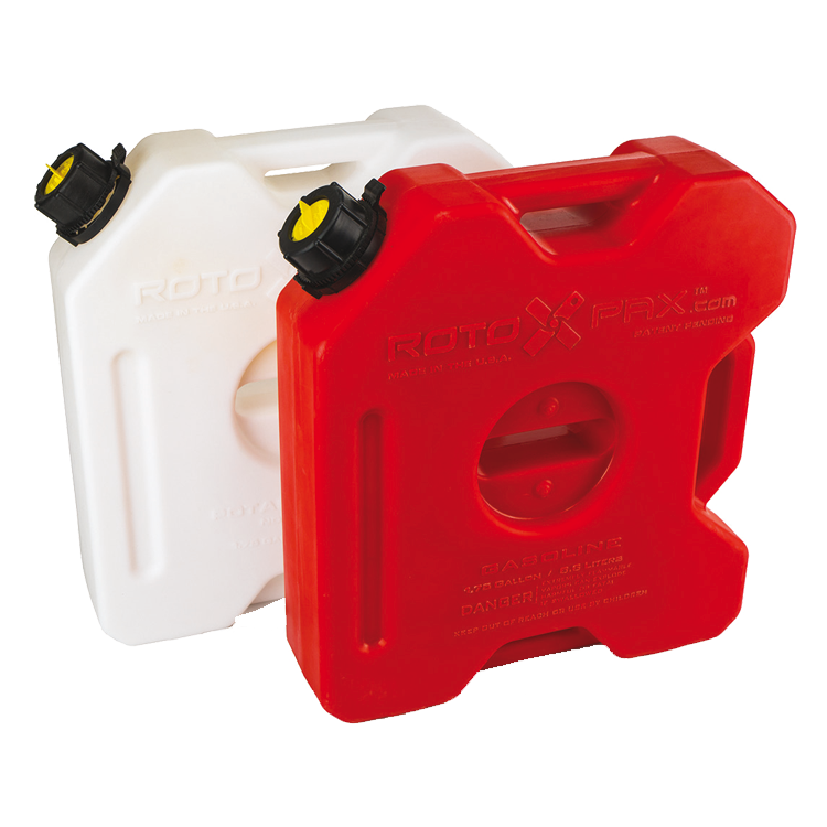 Rotopax es el fabricante de bidones con más calidad del mercado. Rotopax dispone de bidones de 1.75 galones (6.6L) homologados tanto para agua como para combustible que junto a una combinación de soportes especiales es posible montar hasta 2 bidones o lo que sería lo mismo 13.2L de reserva para agua, combustible o 6.6L de cada sobre una maleta rígida o sobre las plataformas OVERLANDER-S mediante una base de fijación y extensión. Los bidones de agua de Rotopax están fabricados con polietileno aprobado por la FDA. De hecho, el agua para consumo u otros usos se pueden almacenar en bidones Rotopax durante un máximo de 6 meses. Nunca agregue agua a un recipiente diseñado para combustible y nunca añada combustible a un recipiente diseñado para agua. ADVERTENCIA: almacene el producto como se especifica en el envase (nunca guarde el agua en un bidón de combustible).