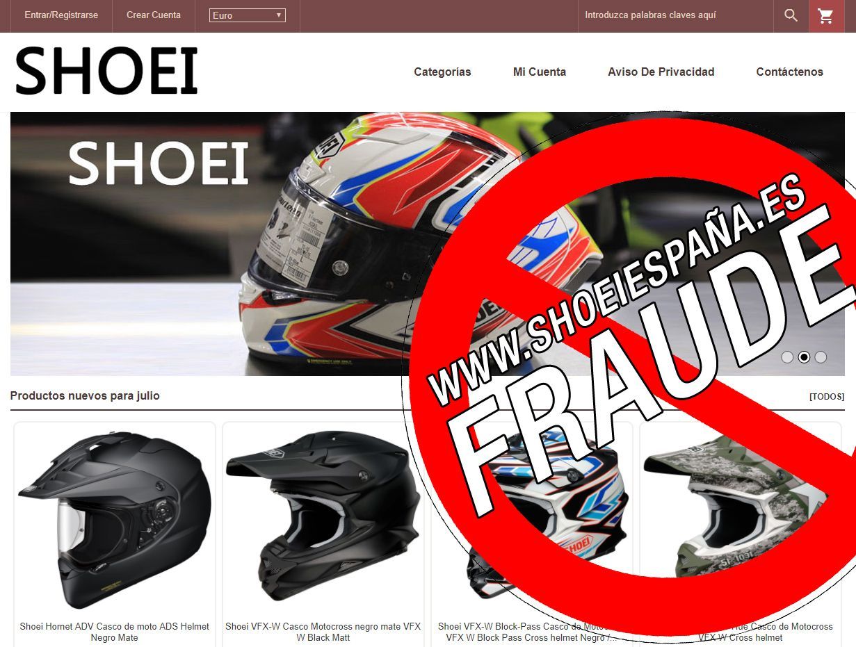 Lamentablemente Shoei España también ha sufrido está práctica a través de una página web totalmente falsa llamada www.shoeiespaña.es . Esta web publicita nuestros cascos con fotos oficiales y precios muy bajos que pueden tentar a muchos clientes a realizar la compra. El cliente realiza la compra y recibe un paquete con un contenido que no tiene nada que ver con lo que han comprado, en este caso, cascos procedentes de China con un valor de 10€. Cuando el cliente quiere reclamar no encuentra donde hacerlo y si quiere anular el cargo en su tarjeta de crédito debe devolver un producto que realmente no tiene.