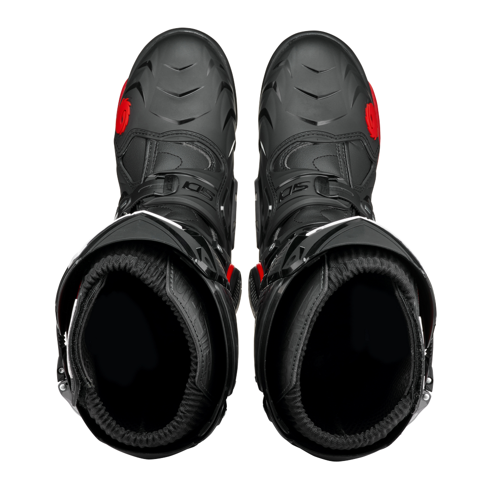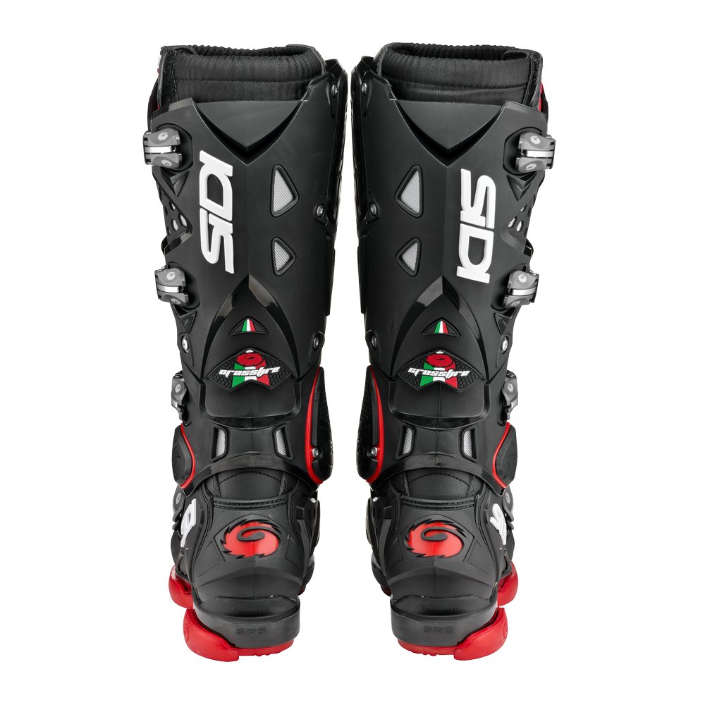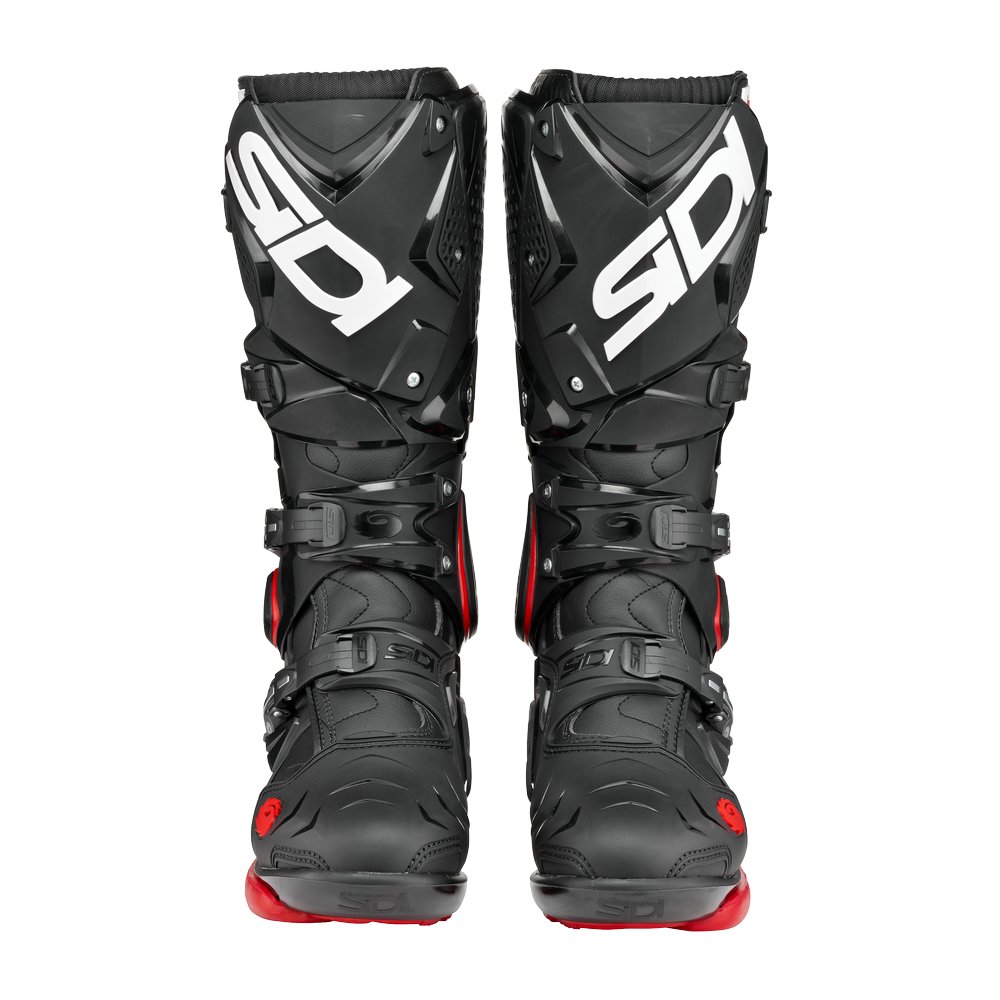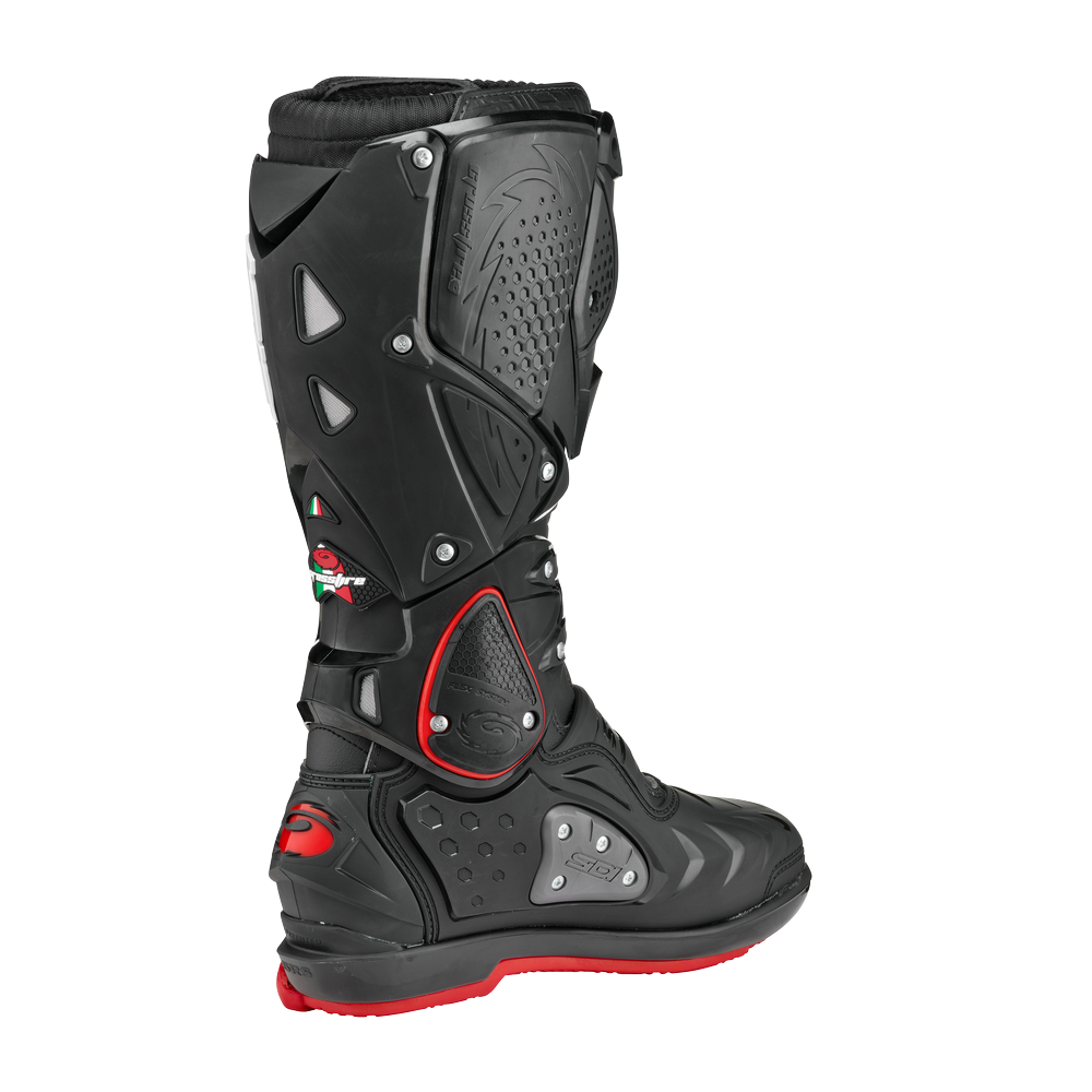 • El sistema exclusivo y patentado por Sidi, permite ajustar el diámetro de la Crossfire 2 en la zona del gemelo. Este sistema, juntamente con las tiras de ajuste más largas, representan un avance en términos de comodidad. La parte interior de la bota está realizada con 2 materiales distintos; uno en plástico rígido para ofrecer soporte a la bota y otro resistente al calor para proteger la pierna del piloto del calor que desprende el escape. Todos los componentes del sistema son reemplazables