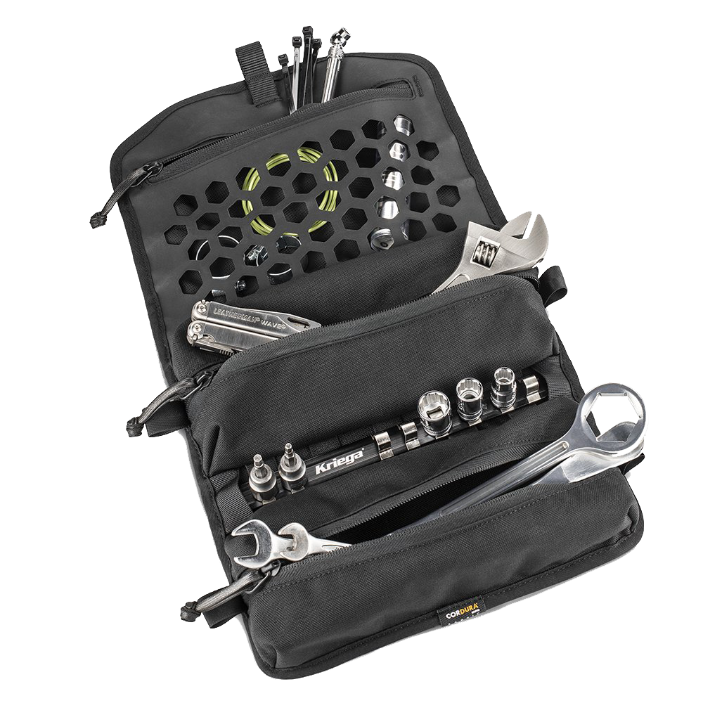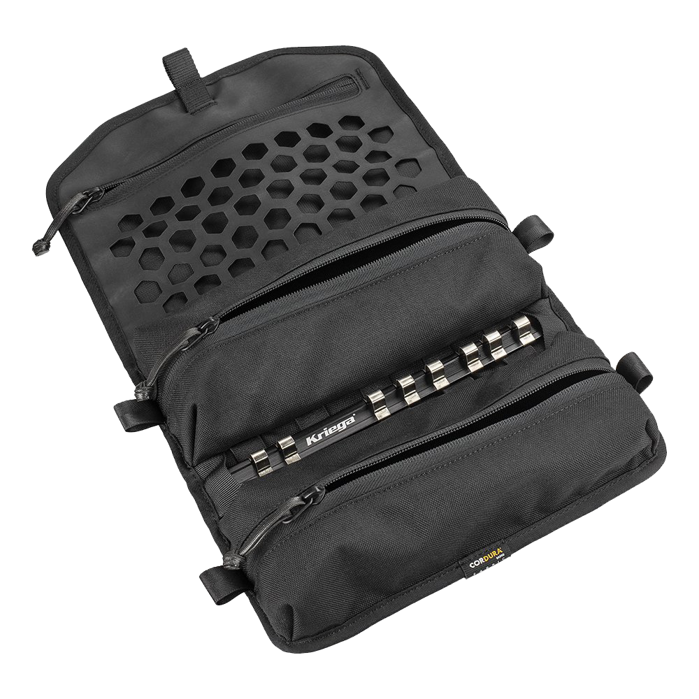 La OS-TOOL ROLL es la "Hermana mayor" de la funda para herramientas Kriega Tool Roll estándar, suficientemente ancha para poder llevar desmontadores de llantas tipo Motion-Pro y una alternativa al almacenamiento con bucles elásticos con bolsillos con cremallera de alta resistencia y diseño de riel para llaves de vaso.