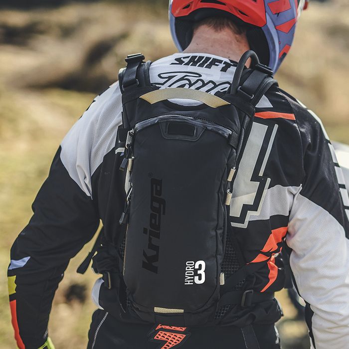 Mochila de hidratación de moto Kriega Hydro-3, una mochila ligera de hidratación con depósito de 3L Hydrapak con certificación militar. La Hydro-3 garantiza un rendimiento muy duradero, algo esencial para la exigente conducción Off Road.