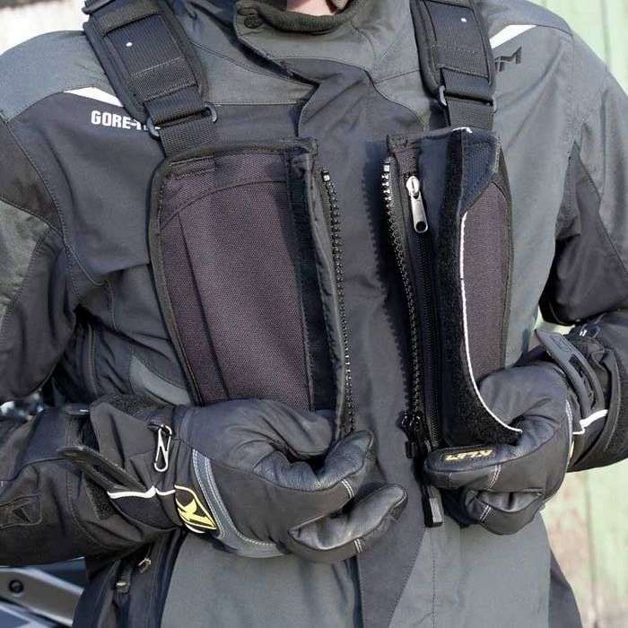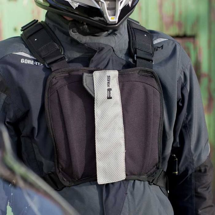 Una vez ajustado, el arnés se abre completamente lo que hace que sea fácil de poner incluso con chaquetas de moto voluminosas.