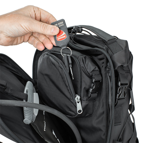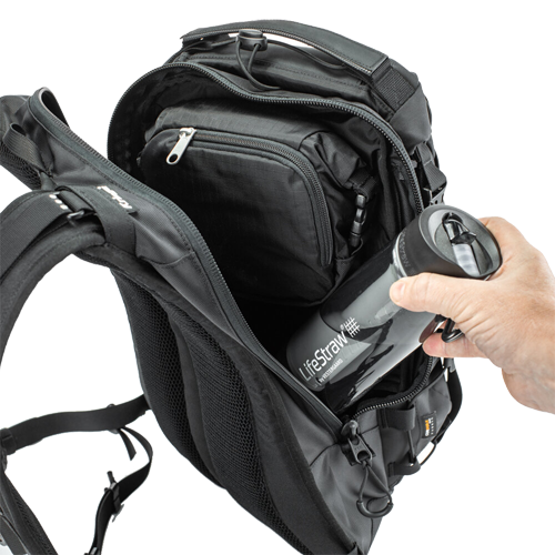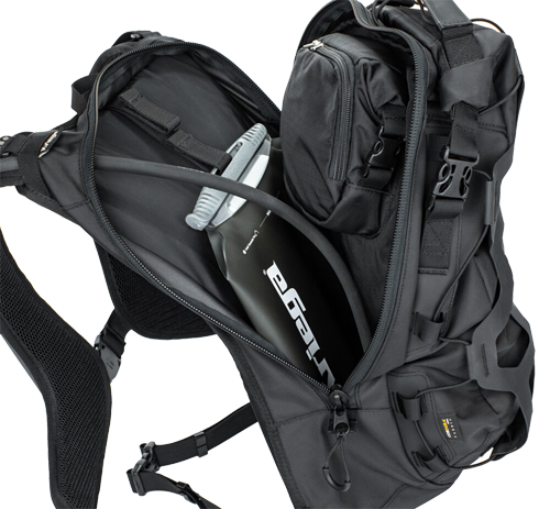 Compuesta de tres secciones: un compartimento trasero de 7 litros con acceso con cremallera para almacenamiento pesado como un porta herramientas, una botella de agua o el depósito de hidratación opcional de 3,75 litros. Esta área también tiene un pequeño bolsillo interno impermeable para un teléfono y la cartera, combinado con el cuerpo principal con cierre enrollable que proporciona un total de 12 litros de almacenamiento 100% impermeable. La innovadora red de Hypalon también proporciona más almacenamiento externo, por ejemplo, para llevar un impermeable.